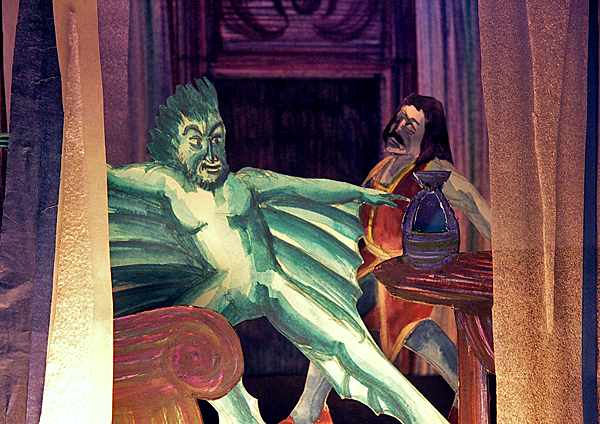 First abstract model theatre show made in 1986 to an electronic soundtrack by Robert Poulter. Six minutes. Other experimental shows include 'Konjunktur', a look at Irwin Piscator's 1920's revolutionary Berlin political theatre featuring Weill's song about Margate, and 'Scriabin's Prometheus - the Poem of Fire', an attempt to recreatee the colour organ score visually that was meant to accompany this 1911 orchestral piece.